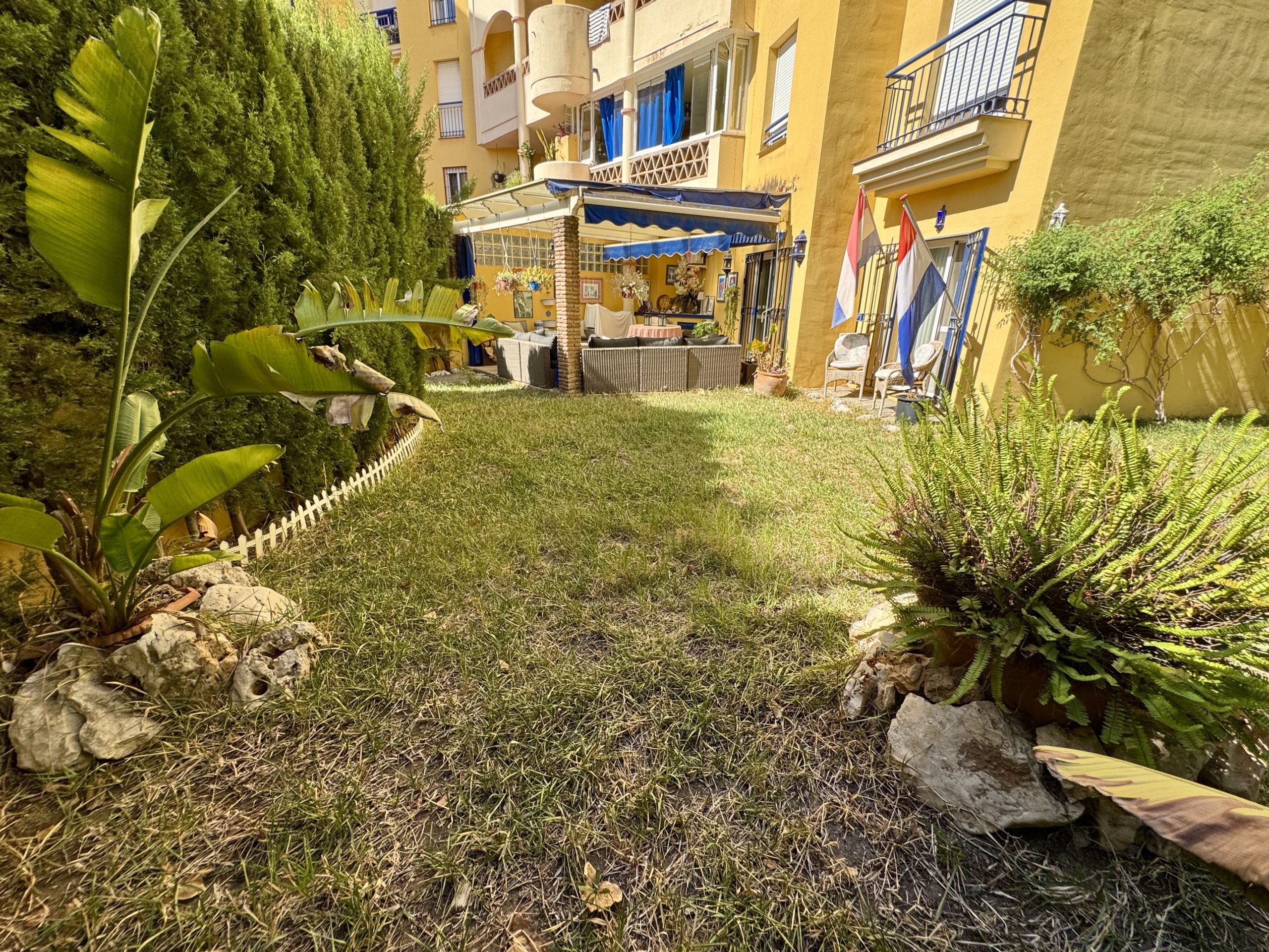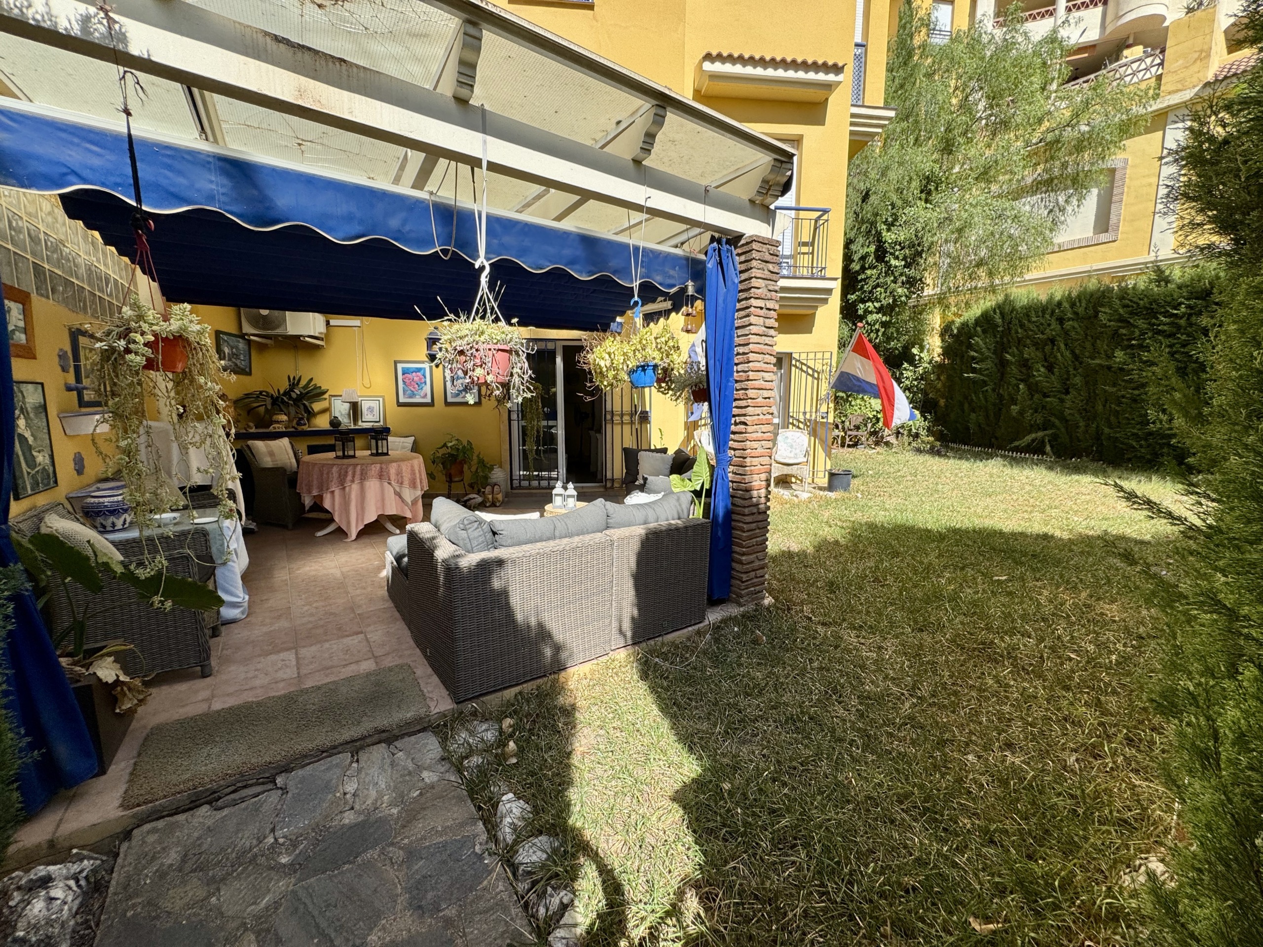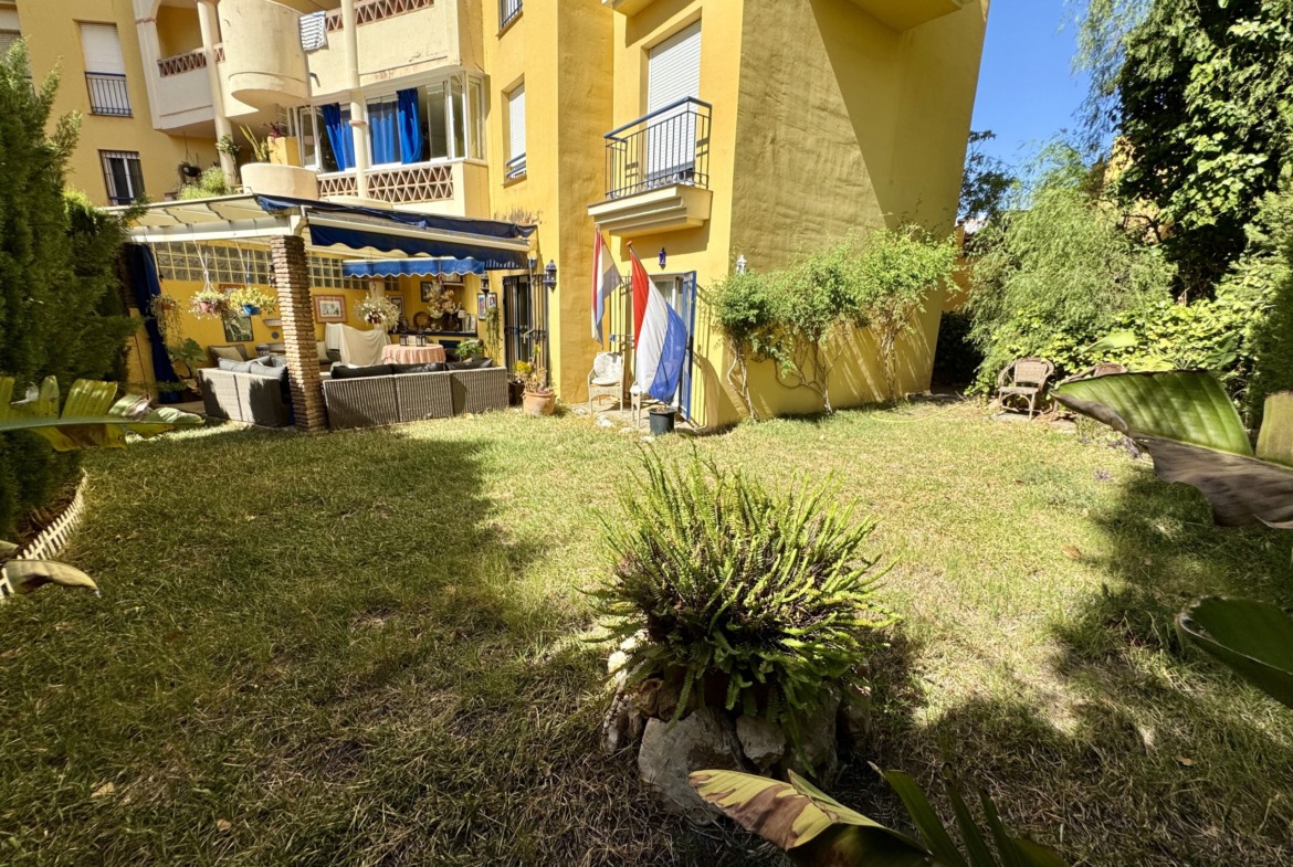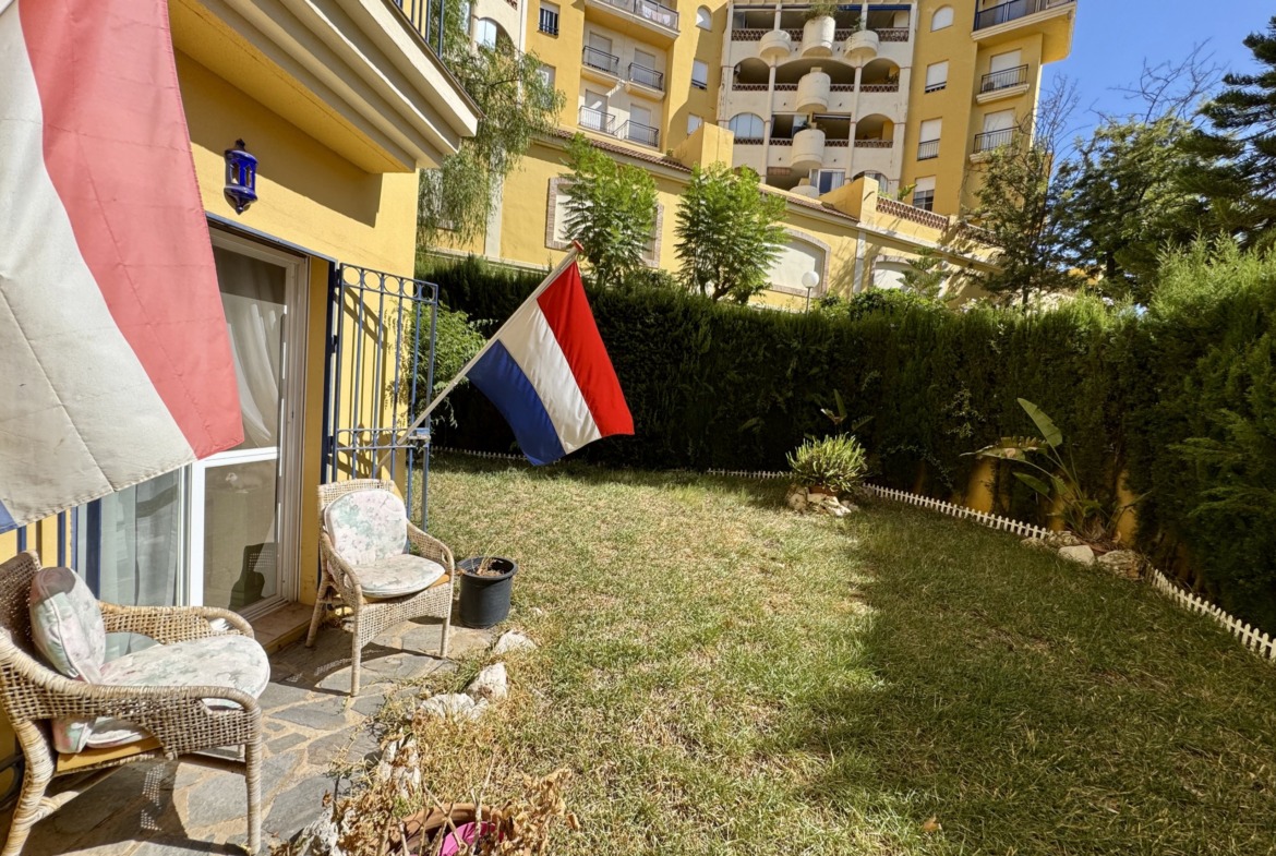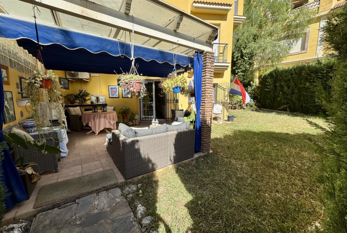 La vivienda se encuentra dentro de un residencial privado con piscina comunitaria y zonas ajardinadas, que destacan por su cuidado y ambiente familiar. Uno de los grandes atractivos de este apartamento es su espectacular terraza y jardín privado de más de 100 m², un espacio exterior único en el que podrás disfrutar del clima mediterráneo durante todo el año. Este gran espacio, conectado directamente con el interior de la vivienda, cuenta con zona de porche cubierta, perfecta para comidas en familia, reuniones con amigos o simplemente relajarse con total privacidad.