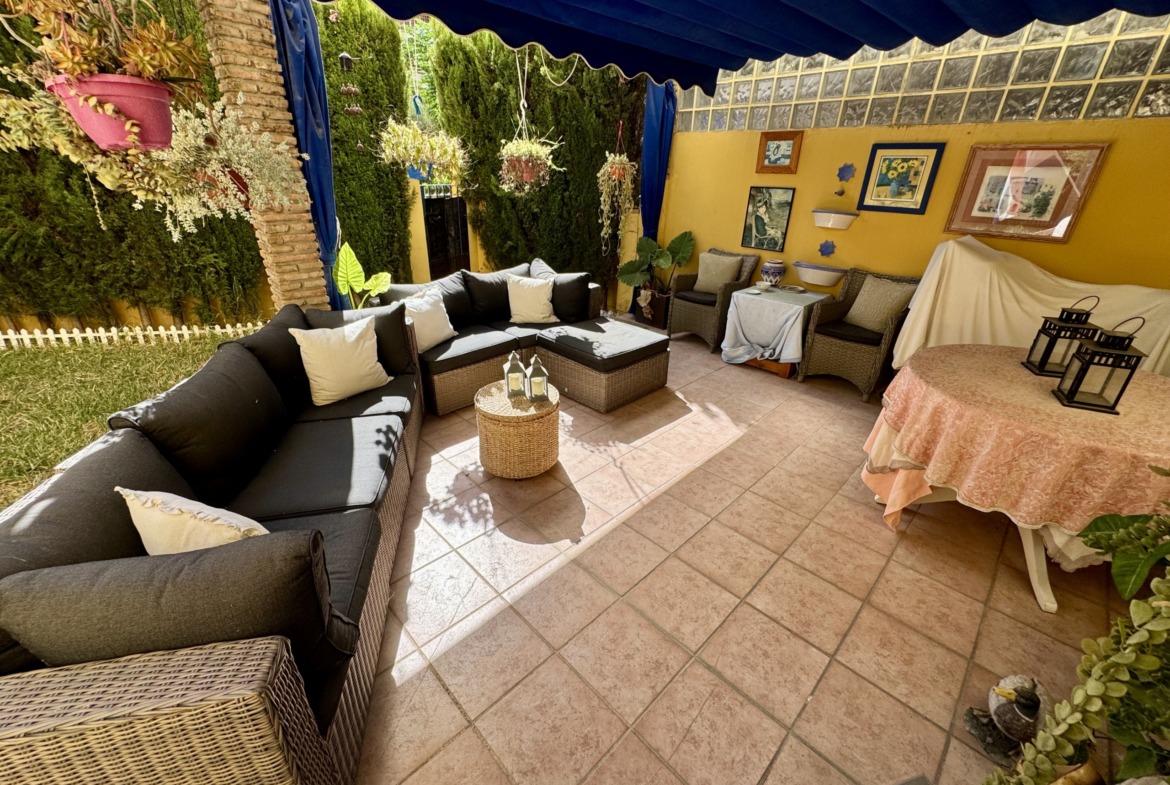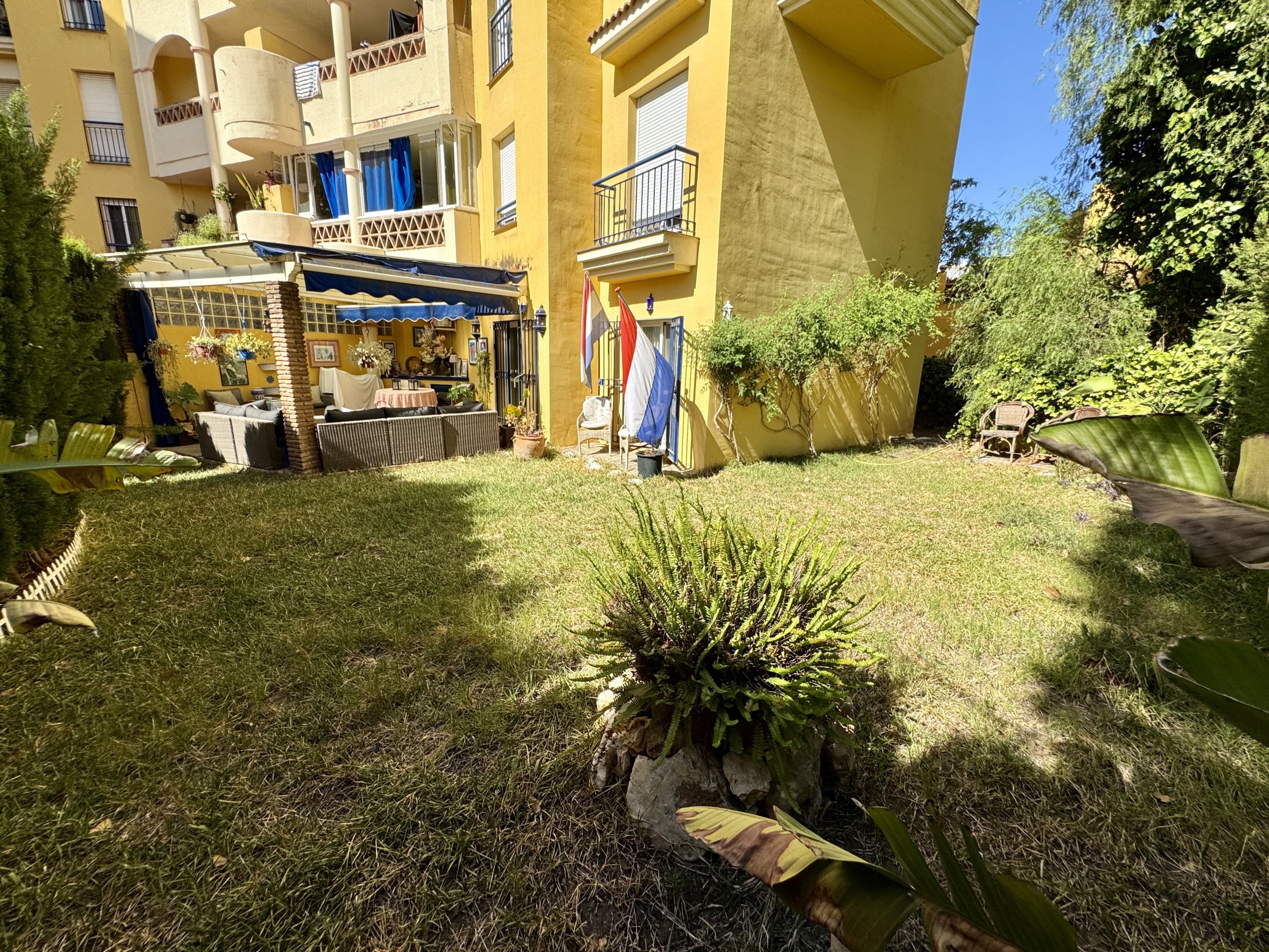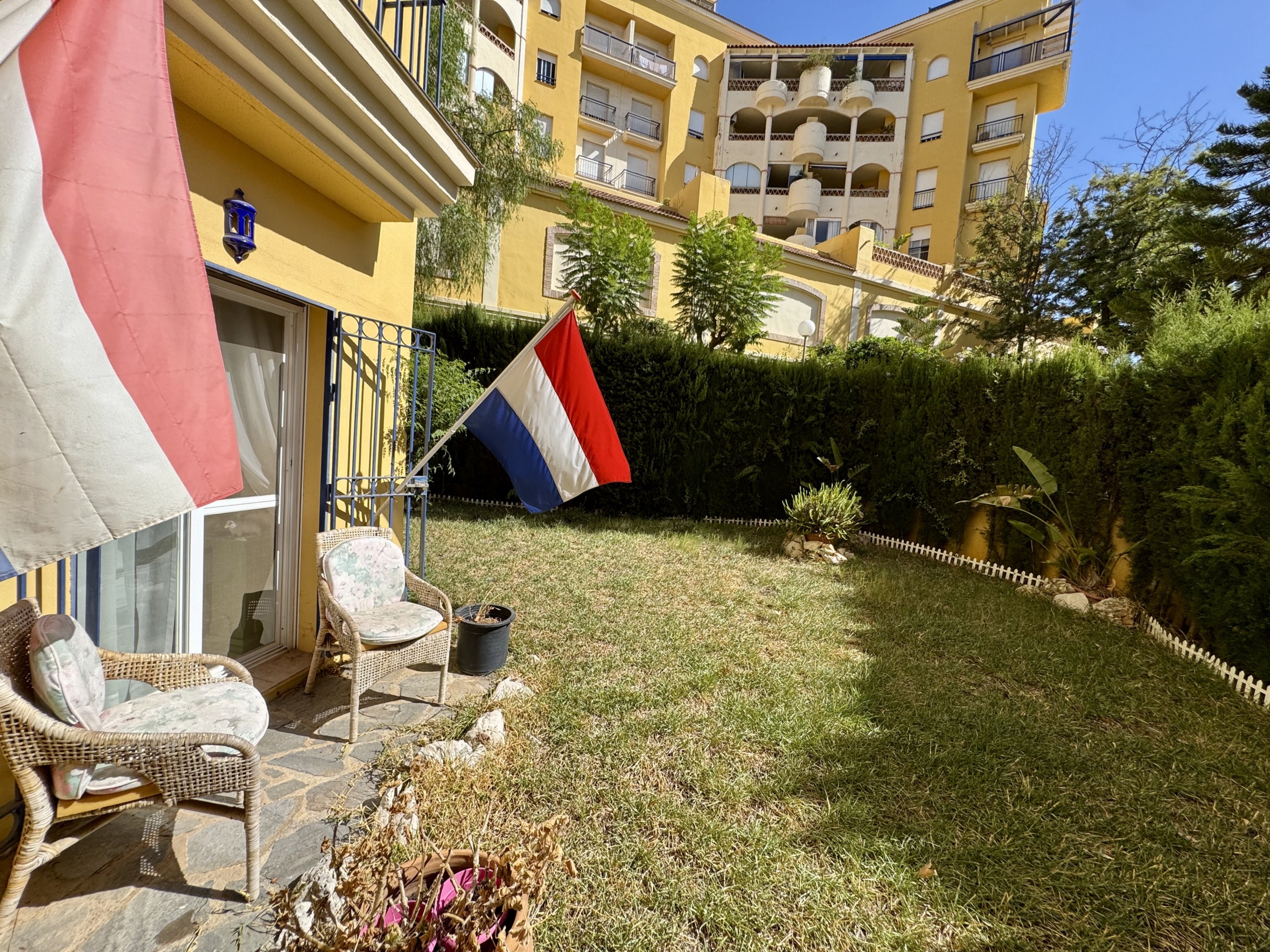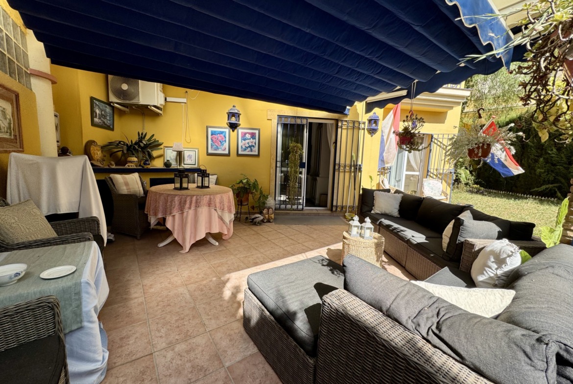 La vivienda se encuentra dentro de un residencial privado con piscina comunitaria y zonas ajardinadas, que destacan por su cuidado y ambiente familiar. Uno de los grandes atractivos de este apartamento es su espectacular terraza y jardín privado de más de 100 m², un espacio exterior único en el que podrás disfrutar del clima mediterráneo durante todo el año. Este gran espacio, conectado directamente con el interior de la vivienda, cuenta con zona de porche cubierta, perfecta para comidas en familia, reuniones con amigos o simplemente relajarse con total privacidad.