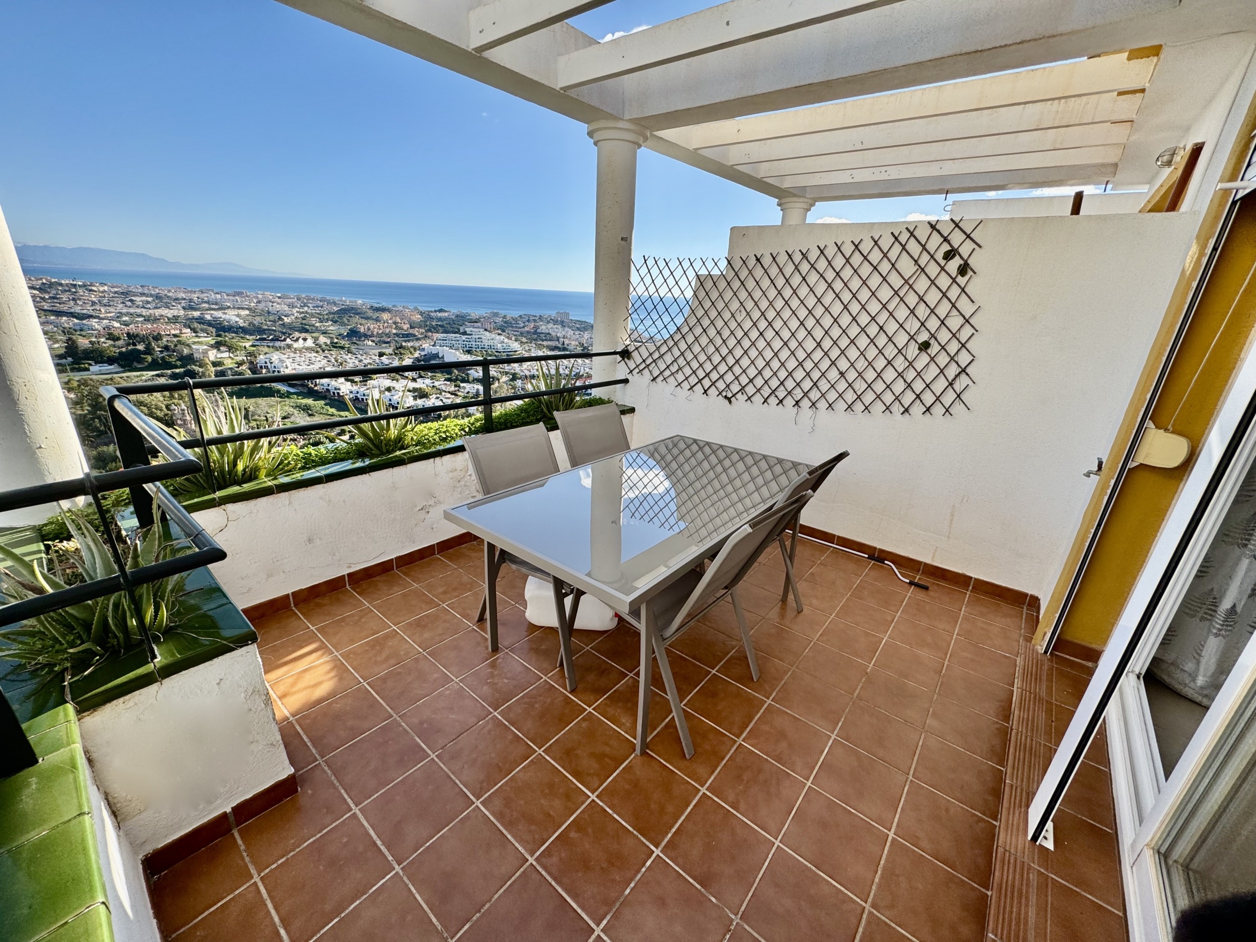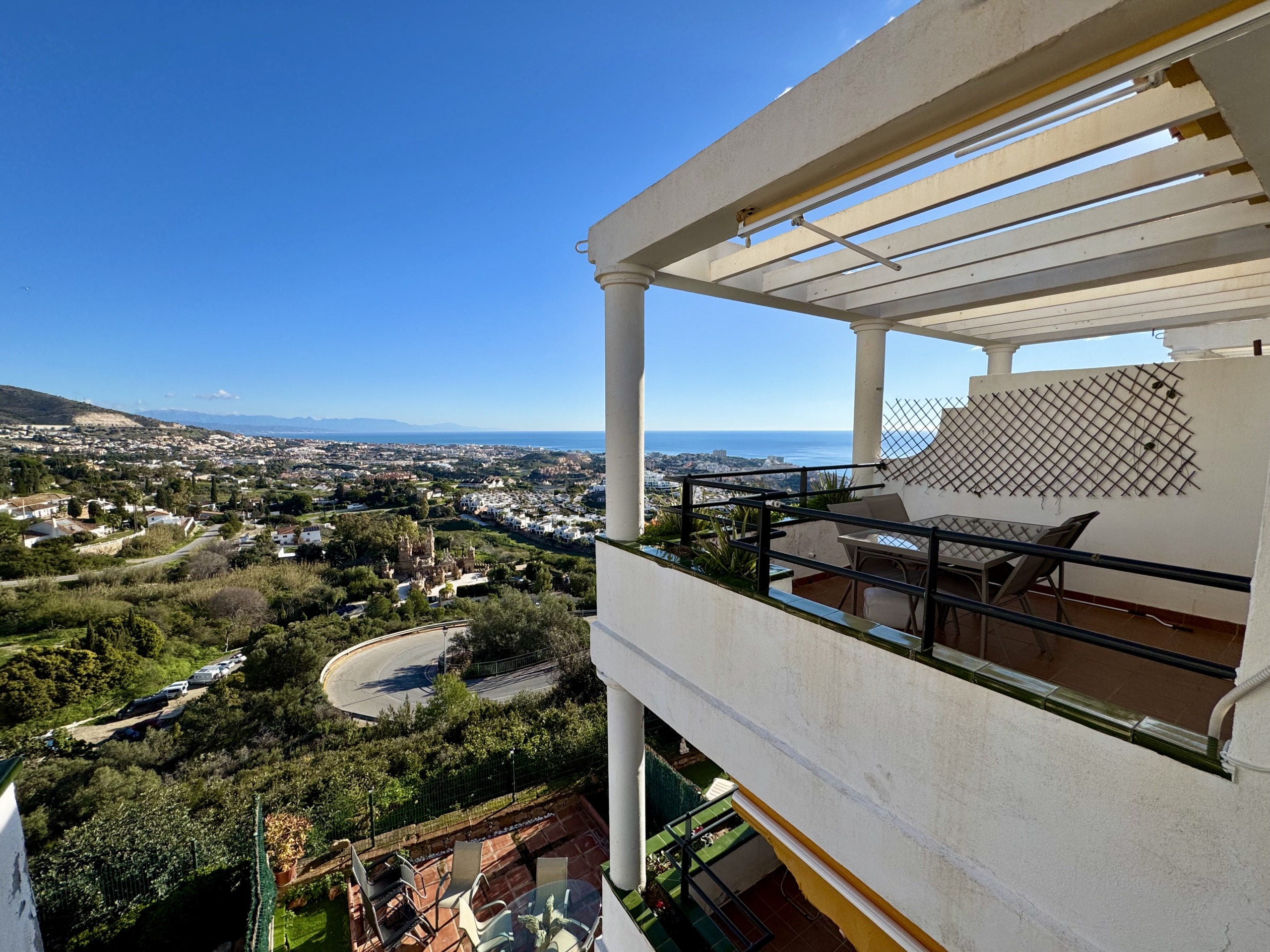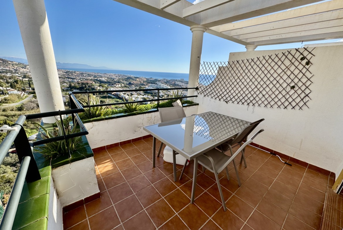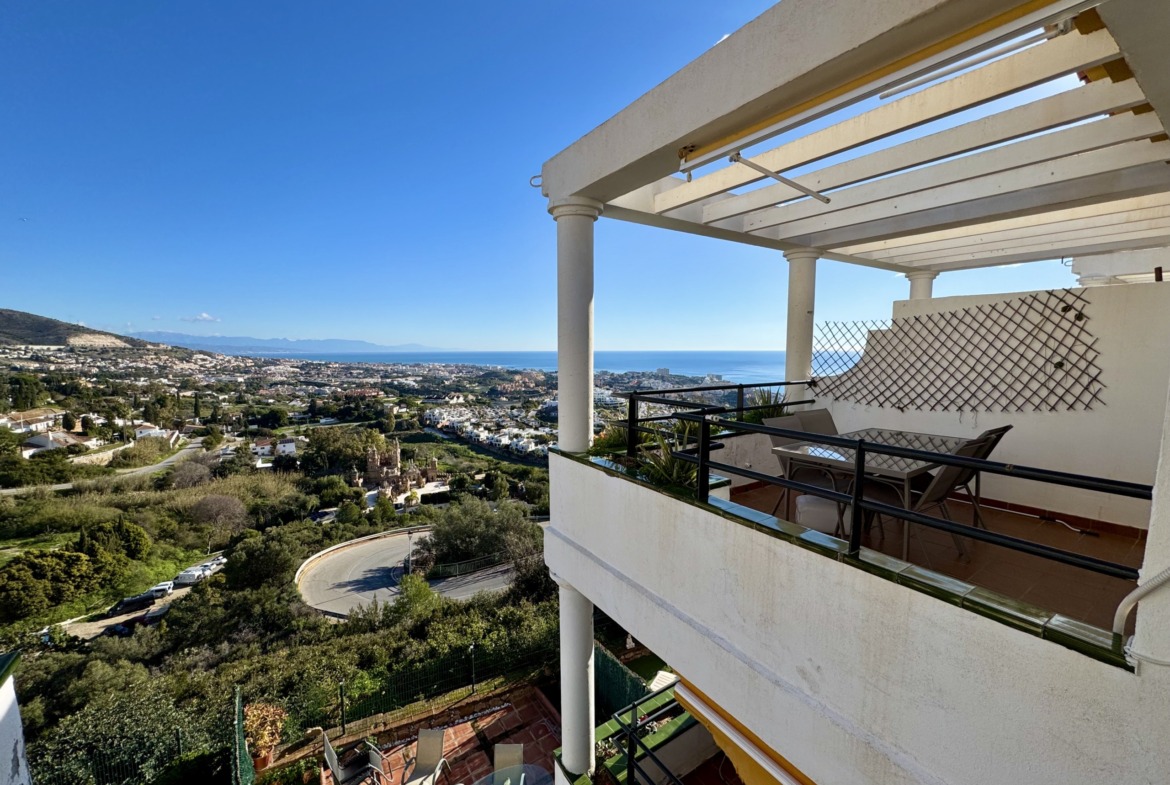 Irene Homes presenta este ático con impresionantes vistas al mar, situado en una posición elevada de Benalmádena Pueblo. Desde la vivienda se disfrutan panorámicas abiertas al Mediterráneo, a la montaña y al pueblo de Arroyo de la Miel, una combinación que aporta una sensación constante de amplitud y libertad.