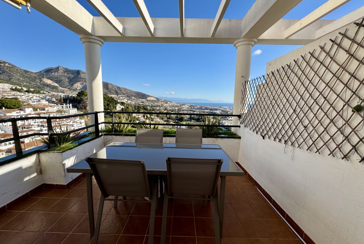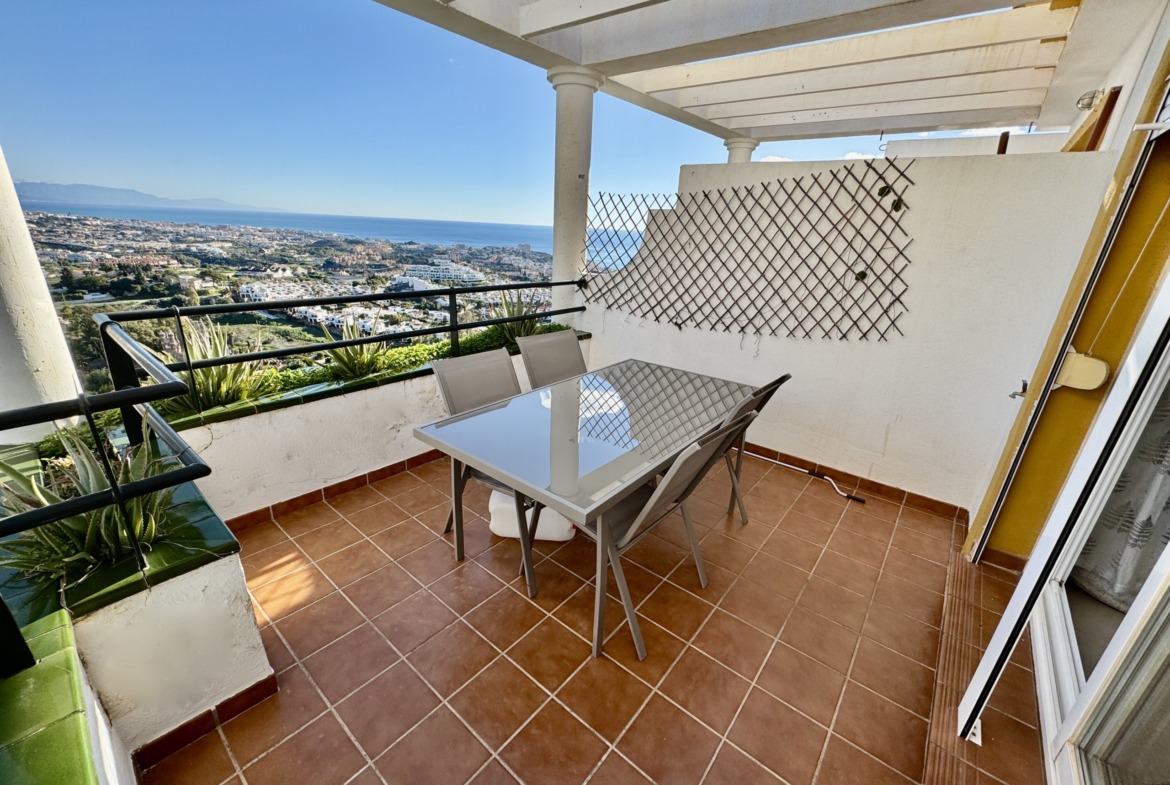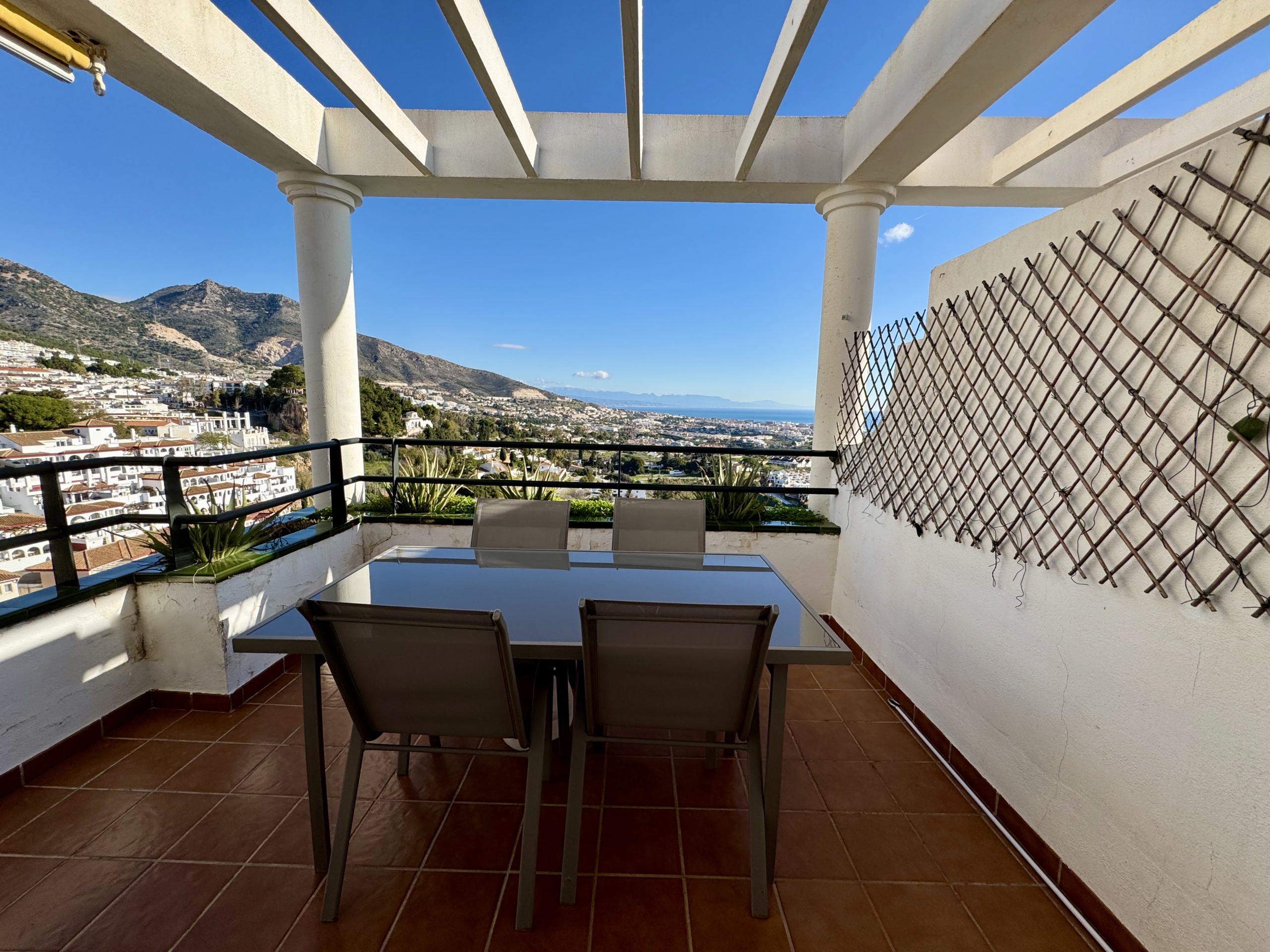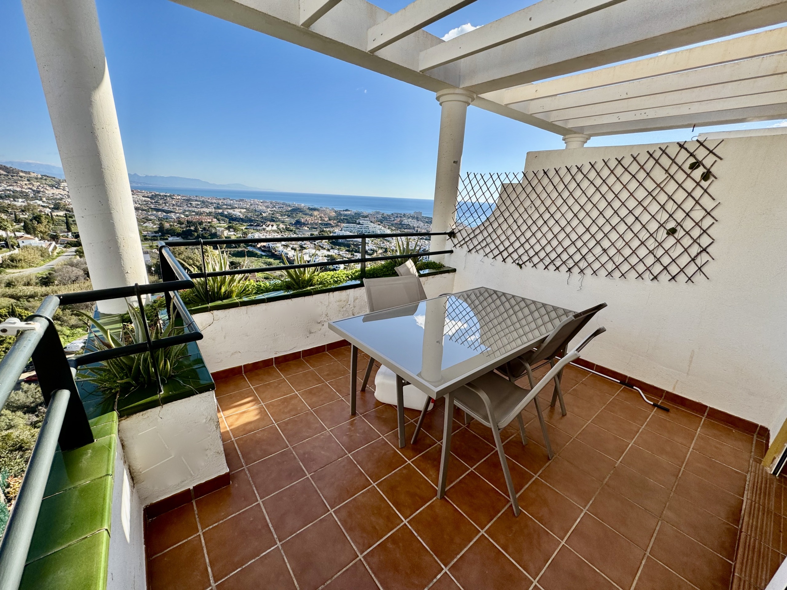 Irene Homes presenta este ático con impresionantes vistas al mar, situado en una posición elevada de Benalmádena Pueblo. Desde la vivienda se disfrutan panorámicas abiertas al Mediterráneo, a la montaña y al pueblo de Arroyo de la Miel, una combinación que aporta una sensación constante de amplitud y libertad.