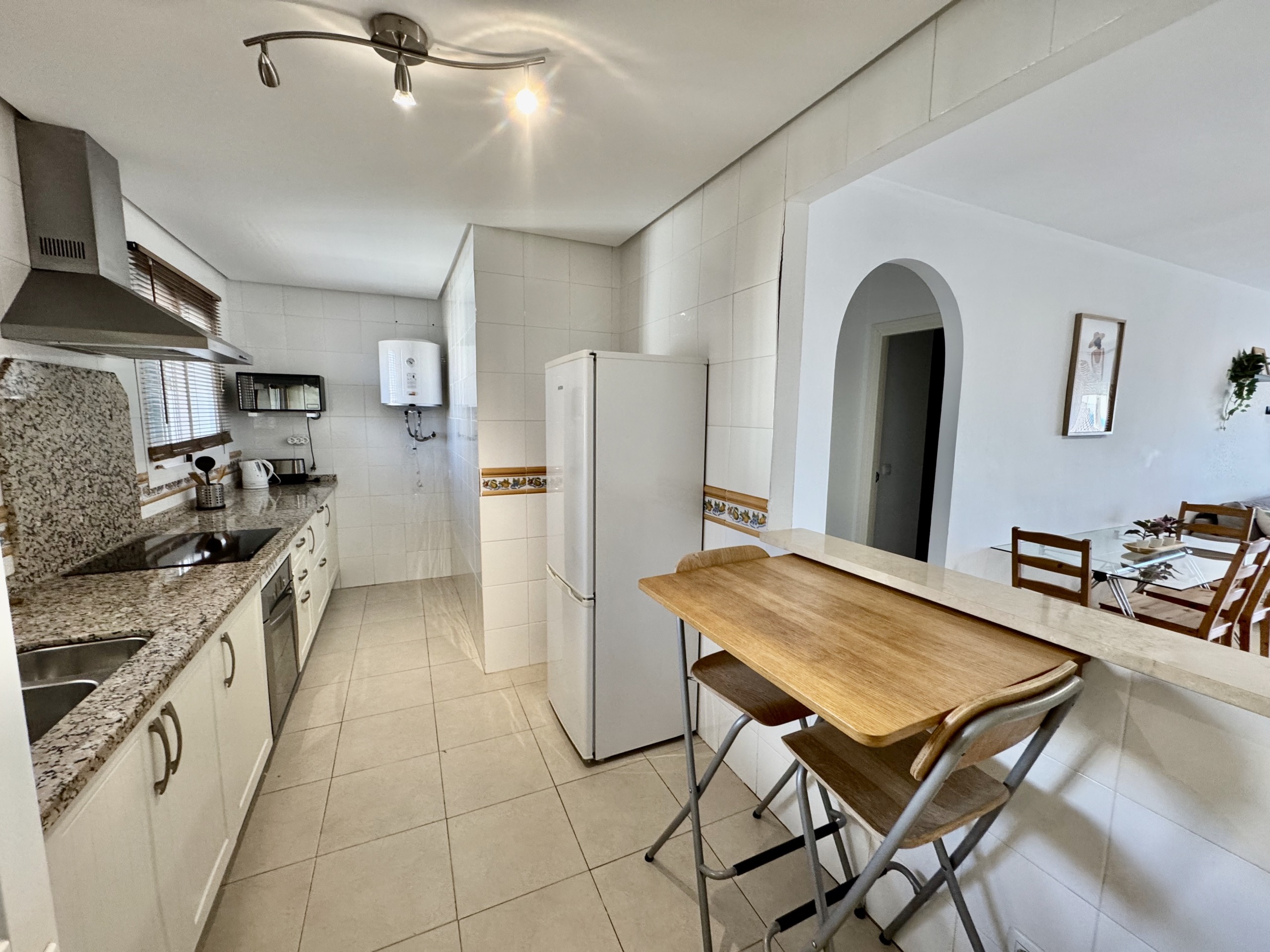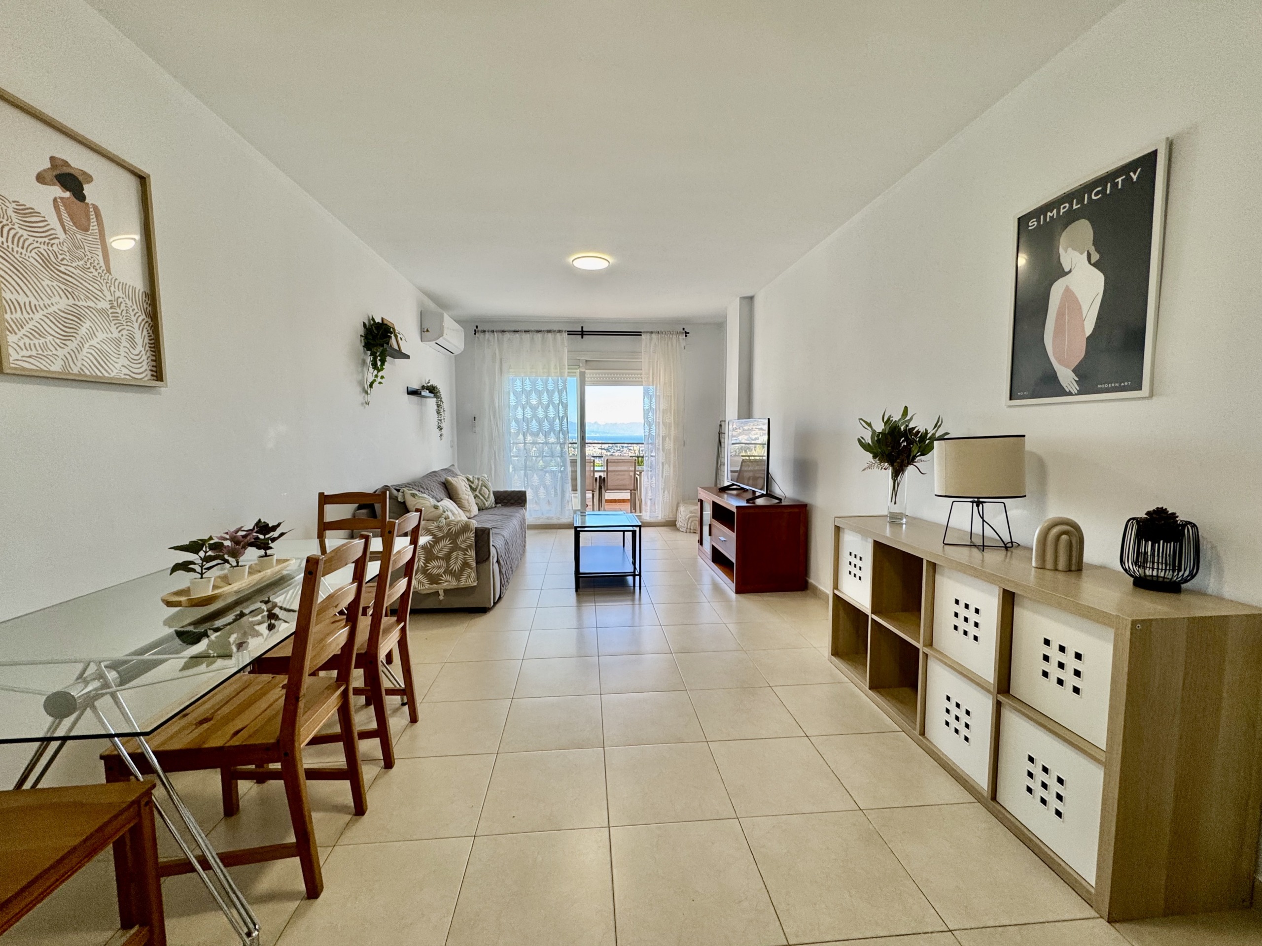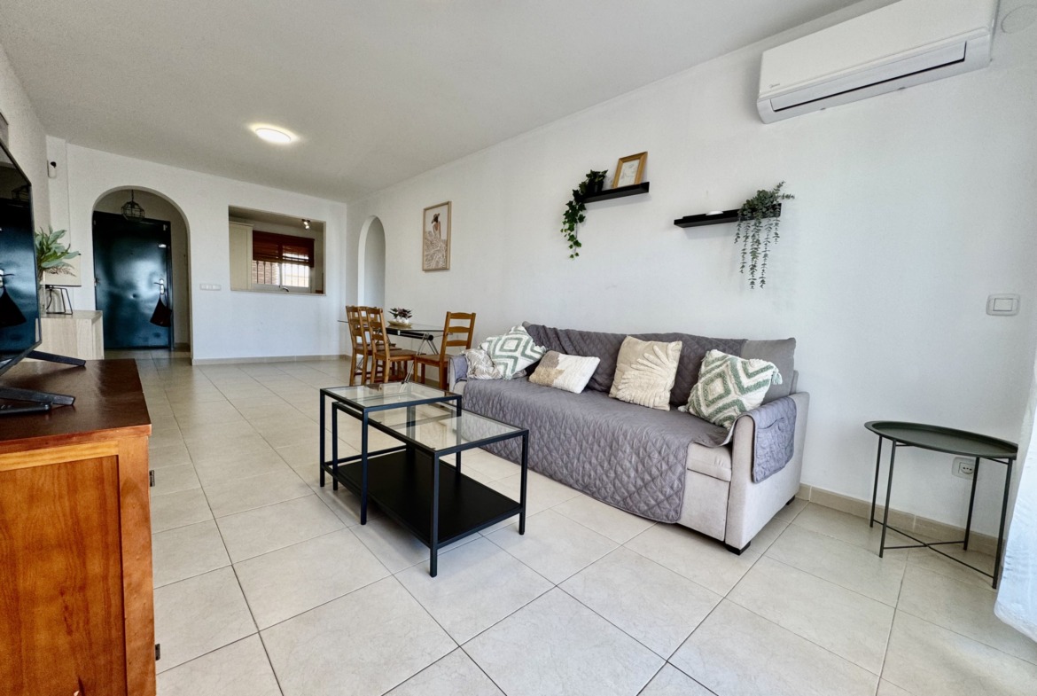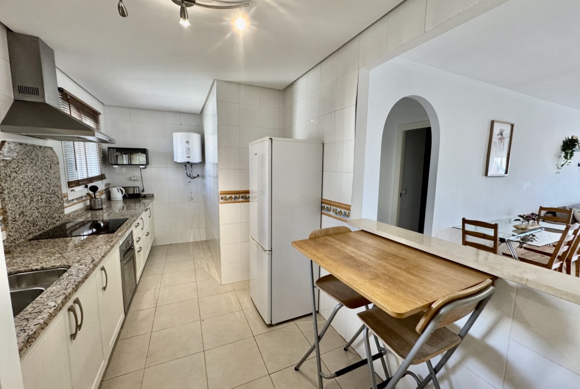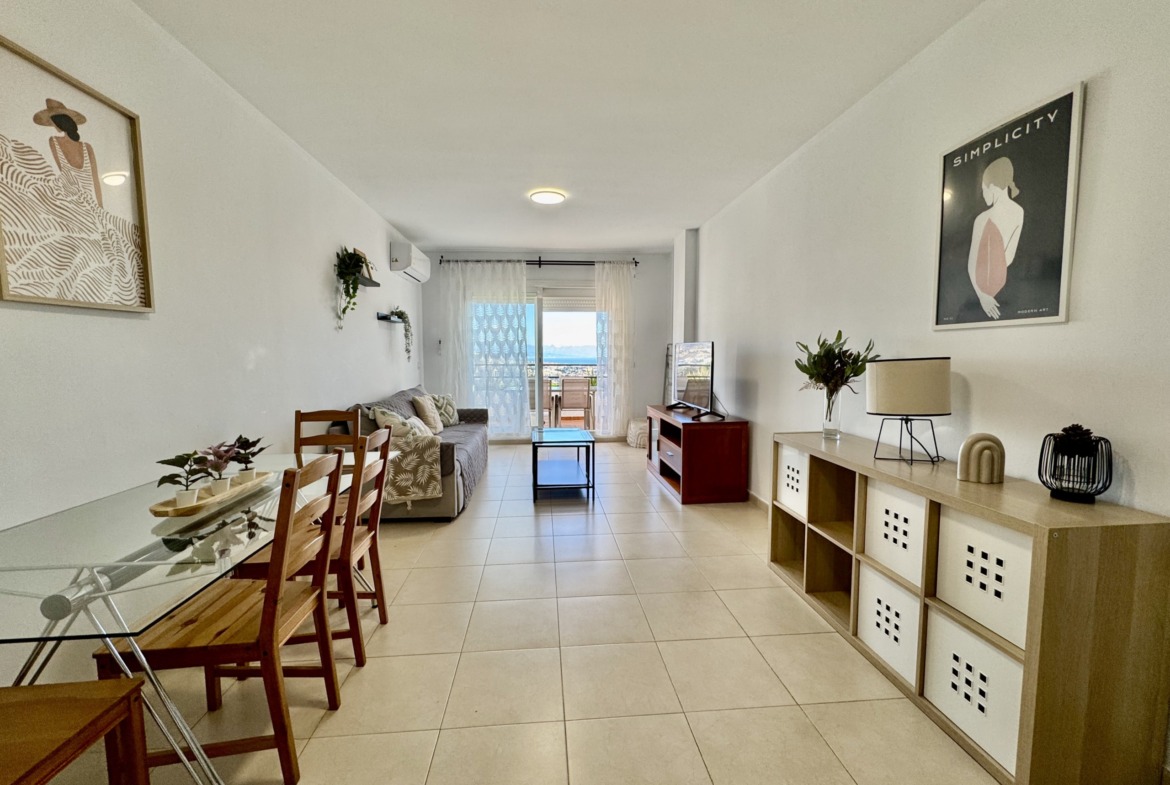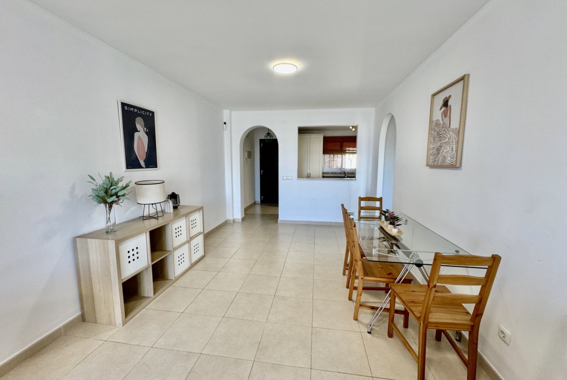 El apartamento presenta una distribución cómoda y funcional. La cocina tipo office se integra de manera natural en el espacio, aportando practicidad al día a día. El salón resulta amplio y luminoso, con acceso directo a una terraza desde la que se puede disfrutar del entorno, del cielo abierto y de unas vistas realmente especiales.